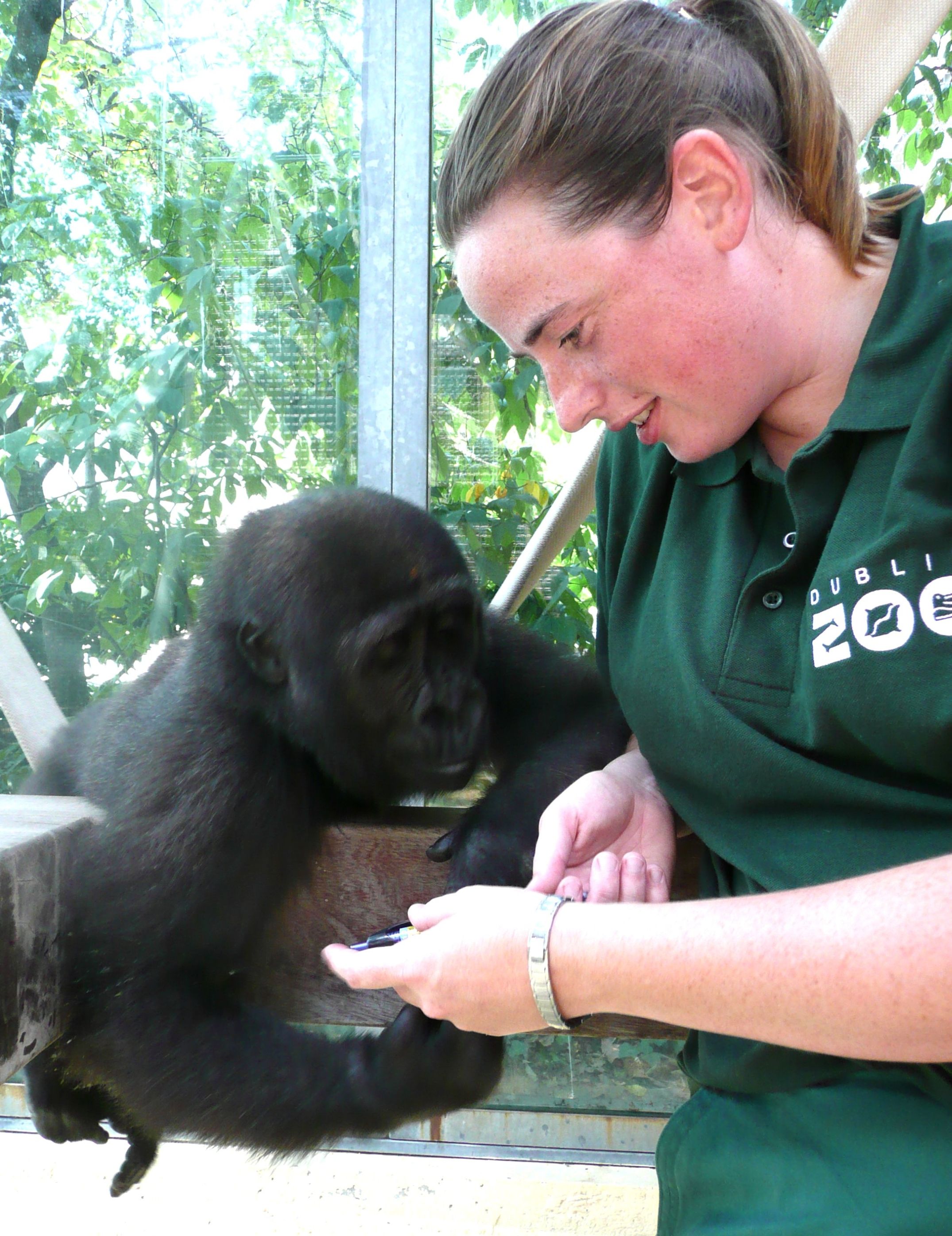 (Zoologisch-Botanischer-Garten Stuttgart, Foto: Mit ihrer neuen irischen Pflegerin Aisleen Greene hatte Claudia sich bei deren Besuch in Stuttgart vor drei Wochen schon angefreundet (c) Wilhelma)