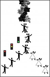 Wissenschaftlich gesprochen lagern sich bei dem Paartanz Moleküle, deren Ges-talt komplementär ist, durch schwache Wechselwirkungen zusammen, so dass ein enger Kontakt entsteht. Dieses Prinzip der „molekularen Erkennung“ wird auch von der Natur genutzt: Millionfach lagern sich die Buchstaben des genetischen Alphabets an eine existierende Buchstabensequenz (ein Gen) an und bilden einen Tochterstrang. So werden Gene dupliziert, bevor sich Zellen teilen, und jede Tochterzelle erhält eine komplette Kopie der genetischen Information. In der Zelle sorgt eine komplizierte Enzym-Maschinerie dafür, dass alle Reaktionen schnell genug ablaufen und dass sich immer die passenden Buchstaben an die existierende Vorlage (Templatstrang) anlagern, also die Basenpaarungs-Regeln der DNA-Forscher James Watson und Francis Crick befolgt werden.