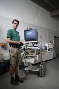 (Zoologisch-Botanischer Garten Stuttgart, Foto: Wilhelma-Tierarzt Dr. Tobias Knauf-Witzens freut sich sehr über den Endoskopie-Turm, der vom Olgahospital gespendet wurde (c) Wilhelma)