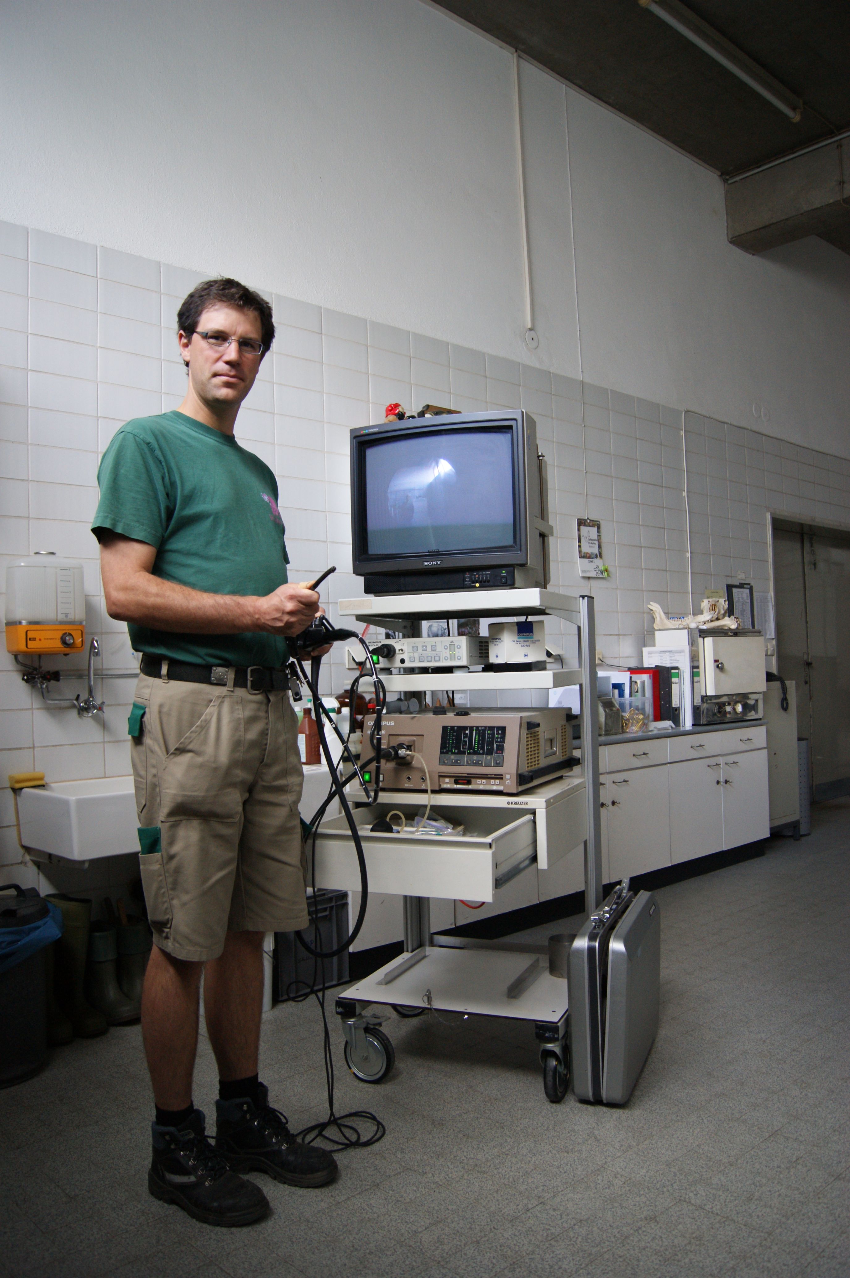 Einen ausgedienten Endoskopie-Turm hat das Olgahospital der Wilhelma geschenkt.Dieser dient zukünftig in der Wilhelma-Krankenstation für Diagnostik und kleine Eingriffe im Magen- und Darmtrakt der tierischen Bewohner des zoologisch-botanischen Gartens. Mit dem Endoskopie-Turm haben die beiden Tierärzte, Annika Krengel und Dr. Tobias Knauf-Witzens, nun die Möglichkeit, Gorilla, Seelöwe und Co. schonend in Magen und Darm zu schauen. Wichtig ist dies vor allem bei Seelöwen und Krokodilen, wo immer wieder Fremdkörper in die Becken fallen und von den Tieren verschluckt werden. Angefangen bei Münzen, über Mützen bis hin zu Kuscheltieren. Zwischen Olgahospital und den Zootierärzten besteht bereits seit längerem ein Kontakt bei speziellen Fragen, vor allem wenn Menschenaffen Probleme haben. So hat dann auch jüngst der Austausch zwischen dem Ärztlichen Leiter des Fachbereichs Allgemeine Pädiatrie, Gastroenterologie und Rheumatologie im Olgahospital, Dr. Axel Enninger, und Zootierarzt Dr. Tobias Knauf-Witzens dazu geführt, dass nun das Medizingerät von der Wilhelma genutzt werden kann. Der Endoskopie-Turm stammt aus den 80er Jahren, verfügt noch über eine alte Fiberglasoptik, ist aber voll funktionsfähig. Dr. Knauf-Witzens freut sich über das Gerät: „Manch ein Kollege wird uns darum beneiden.“