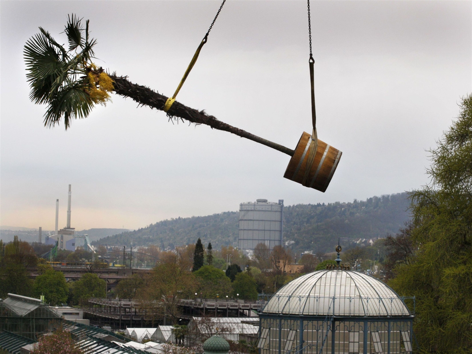 Viele Menschen fliegen extra in den Süden, um unter Palmen zu liegen, in der Wilhelma ist es umgekehrt: Hier werden die Palmen an sonnige Plätzchen „geflogen“, damit die Menschen auch in Stuttgart unter ihnen lustwandeln können.Am frühen Mittwoch Morgen des 18. April hieß es auf den Subtropenterrassen daher für 20 exotische Passagiere erneut: „Ready to take off“. Und nur eineinhalb Stunden später waren alle wieder sicher gelandet. Eine Palme macht zwar noch keinen Sommer – aber vielleicht 20? Denn so viele sind alljährlich zum großen Flugtag eingeladen. Ihre Sommerresidenz liegt auf den mittleren und oberen Subtropenterrassen unterhalb des Aussichtspavillons Belvedere – ein sehr idyllisches aber teils nur schwer über Treppen zugängliches Terrain. Keine Chance also, die sechs Meter hohen und bis zu einer halben Tonne schweren Pflanzen samt ihren Kübeln durch pure Manneskraft hier herauf zu hieven! Und so rückt jedes Jahr Mitte oder Ende April der Kran an, ohne den die schwergewichtigen Pflanzen nicht zum Abheben zu bewegen wären. Als wachsame Fluglotsen und routinierte Platzanweiser mit von der Partie sind natürlich die Gärtner – insgesamt neun Männer – denn jede der 20 erforderlichen Einzelflüge und Landungen am Zielort ist Maßarbeit. Bereits Ende März haben die Gärtner die Palmen mit viel Muskelsatz und Know-how aus ihren Winterquartieren bugsiert und an die frische Luft gesetzt, auf dass sich die exotischen Hoheiten peu à peu an die neue Freiluftsaison gewöhnen. Auch die exakte Platzierung jeder Palme auf ihrem sommerlichen Stammsitz bleibt Handarbeit – 14 Pflanzen zieren die obere, sechs die mittlere Subtropenterrasse. Doch warum all diese Mühe? Lassen sich die als kältetolerant bekannten Chinesischen Hanfpalmen nicht auch im Freiland überwintern? Das ginge zwar schon, aber eine attraktive Alternative wäre es nicht. Denn gegen den Frost müssten sie aufwändig in eine optisch wenig ansprechende Schutzhülle verpackt werden – keine Zierde für den Park. Besser also, die Palmen Ende Oktober wieder ins Winterquartier zu fliegen, wo sie sich im hohen, luftigen Gewächshaus hinter den Kulissen bei sechs bis acht Grad ausruhen können. Um im nächsten Jahr erneut in die Luft zu gehen und einen Hauch von Süden in den Wilhelma-Park zu bringen. Im Hintergrund: Die Chinesische Hanfpalme Ihren botanischen Namen Trachycarpus fortunei verdankt die Chinesische Hanfpalme dem englischen Botaniker Robert Fortune (1812 – 1880) sowie den griechischen Wörter „trachys“ für „rau“ und „karpos“ für „Frucht“. Ihre ursprüngliche Heimat sind die subtropischen Gebiete Zentral- und Ostchinas, die ersten Samen brachte 1830 der Naturforscher Philipp Franz von Siebold nach Europa. In den Alpenländern, wo sie bald stark verbreitet war, wird sie heute auch „Tessiner Palme“ genannt. Ihr schlanker Stamm ist anfangs vollständig, bei älteren Pflanzen nur noch im oberen Teil mit braunen, zähen Fasern bedeckt, aus denen in China Besen, Bürsten, Matten, Stricke und sogar regendichte Kleidung hergestellt wird. Über zehn Meter hoch können Hanfpalmen werden, ihre dunkelgrünen Fächerkronen aus 50 und mehr Blattfächern bestehen. Erst ab einem Alter von zehn Jahren und einer Stammhöhe von etwa einem Meter beginnt die Hanfpalme im Frühjahr zu blühen – ein gutes Zeichen übrigens, dass es ihr gut geht. (Quelle: Wilhelma – Zoologisch-Botanischer Garten Stuttgart)
