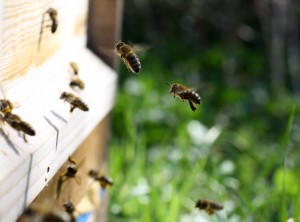 (Presse Wilhelma Stuttgart, Foto 1: Honigbienen im Anflug an den Bienenstock, (c) Richard Odemer)